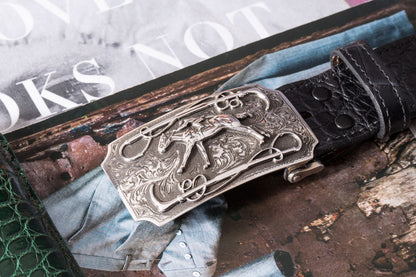 Celebrate the Sport of Kings with this horse-racing-themed buckle. Jockey and rider are framed by two riding crops and placed on a “racetrack” of hand-engraved sterling silver. Handmade in the USA by Comstock Heritage, it measures 3.25 inches x 1.25 inches and fits all 1.5-inch belt straps.
