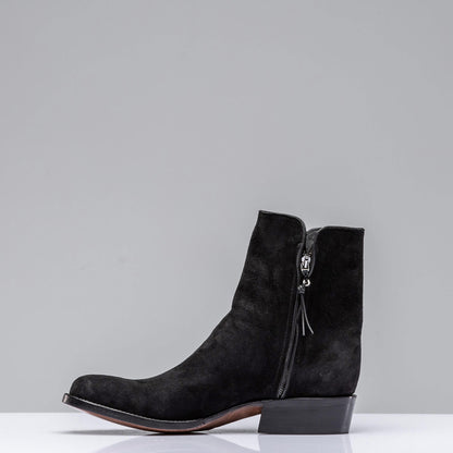 The round toe Zorro boot is a low-profile Roper-style that boasts unmatched quality in its simplicity. A sharp black suede nubuck skin creates a sleek finish, while the overall styling puts it squarely between a dress boot and a cowboy boot. Side-zipper makes for easy-on-off and all but guarantees a good fit. Also works with a wider range of jean cuts (an underrated convenience). Each pair is handmade by artisans from Stallion Boot Company of El Paso, Texas with 30 or more years of experience.