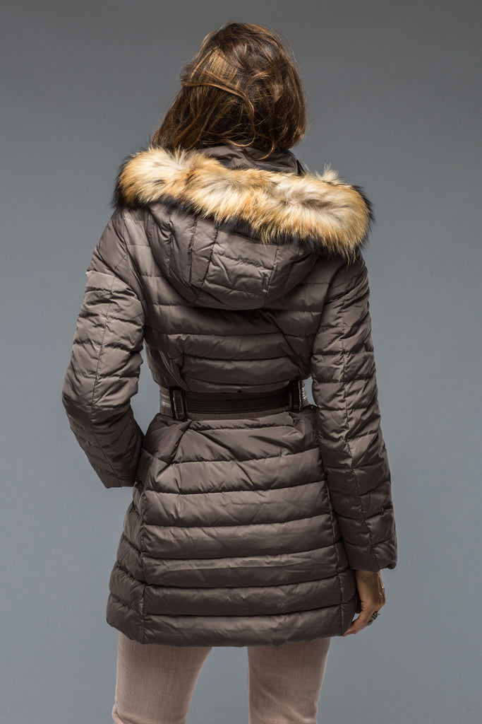 Features include a fur-trimmed hood, two-way front zipper, and a slightly flared hem that complements the fitted shoulder line. Lightweight yet incredibly warm, it’s the perfect piece for both style and practicality.