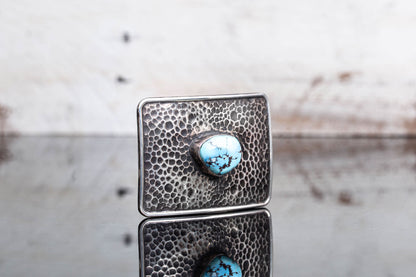 The Golden Hill Trophy Buckle is a sterling silver trophy-style buckle that combines refined texture with natural beauty. Its wire edge frames an inlaid hammered finish, adding depth and dimension to the design. At the center, a rounded piece of American Turquoise brings a vibrant pop of color, making this buckle a distinctive statement piece.