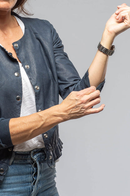 The Kylie Perforated Leather Jacket is a modern take on effortless style, blending sophistication with an edgy, laid-back feel. Crafted from luxuriously soft perforated lambskin, this jacket is designed for lightweight breathability while maintaining a sleek, structured silhouette. The snap-front closure adds a casual element, allowing for versatile styling options, whether worn open over a tee or buttoned up for a more refined look. The slightly cropped fit, subtle ruching at the hem, and three-quarter-length sleeves enhance its contemporary appeal, making it the perfect layering piece for any season. The interior is finished with a playful printed lining, adding a unique and unexpected touch. Made in Italy, this jacket exudes quality craftsmanship and timeless elegance.