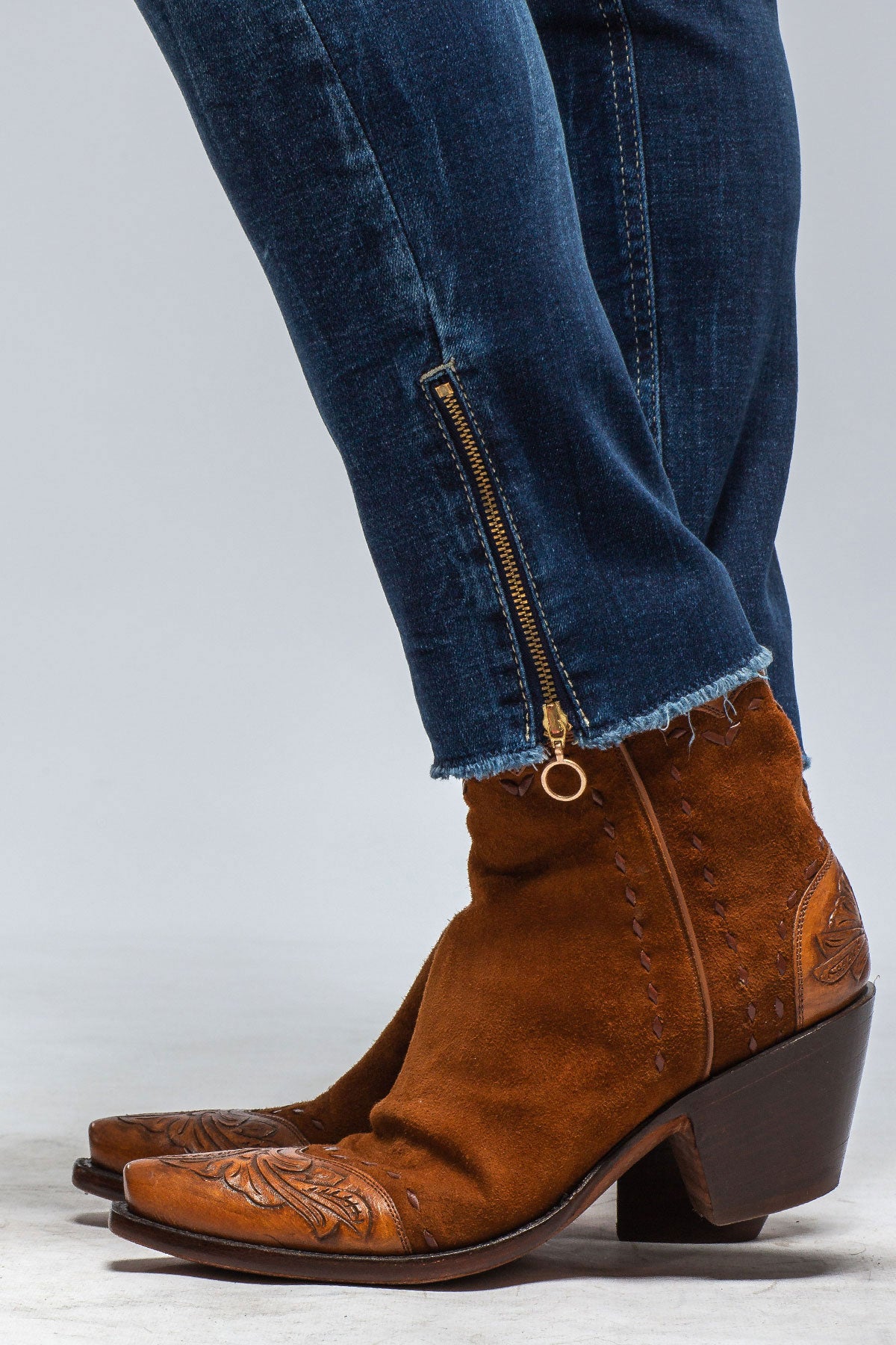 - Frayed hem at front