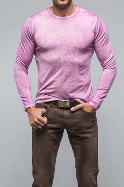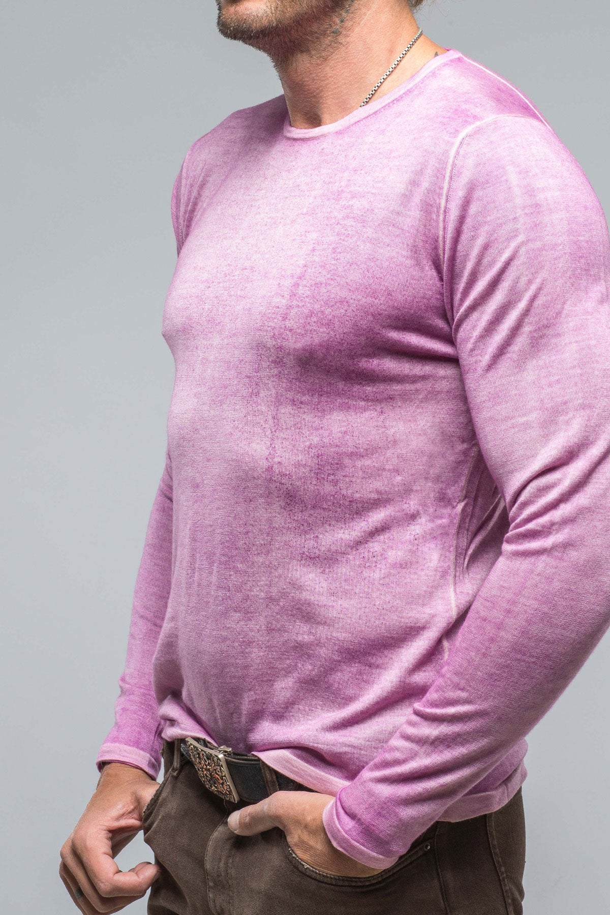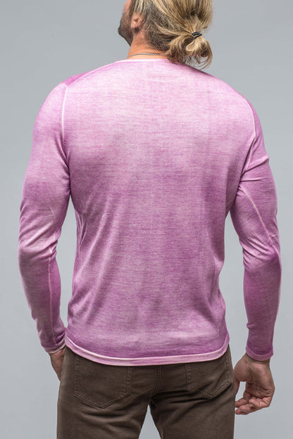 Lightweight 16 gauge cashmere knit starts its journey as a solid steel grey hue, then is artfully overdyed with a purple color treatment. The resulting effect is a heathered melange of icy grey and vibrant purple.