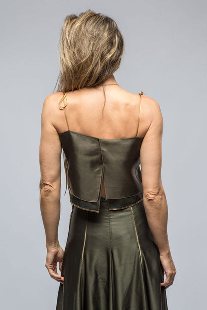 This top can stand alone and redefine an outfit, or it can make an excellent layering piece under a jacket or coat. The material, referred to as "powin shine", has a smooth silky hand and drapes beautifully. It is the perfect length to pair with a high waisted bottom for a flirty, feminine look.