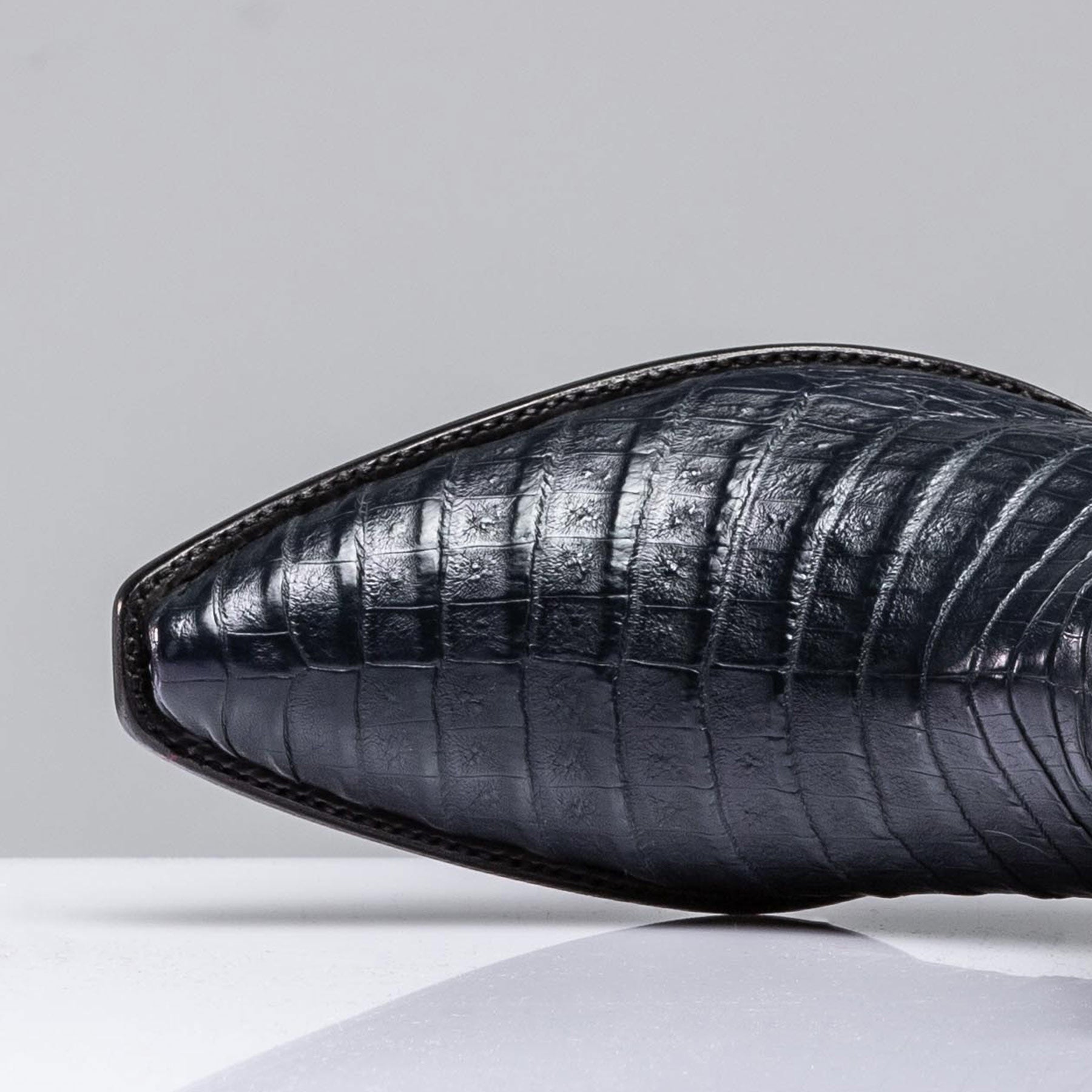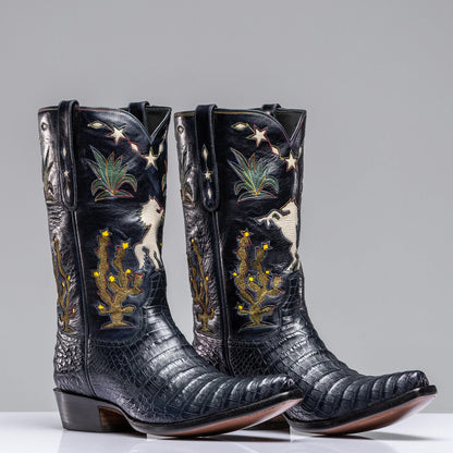 Embraced as an icon of the American dream, the cowboy boot has a hardworking heritage. In the case of the Stallion Cactus Inlay Western boots, a renaissance of artful boot-making has taken place embracing the vintage beauty of the classic boot. Featuring a navy calfskin upper that is decorated by impressive inlays of floral budding cacti, an iconic white stallion on the front and back of the shaft, and accompanied by star and diamond details. A personal favorite of Axel's, this is a sharp boot with a bit of unexpected flair. Each pair is handmade by artisans from Stallion Boot Company of El Paso, Texas with 30 or more years of experience.