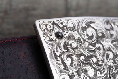 At the heart of this stunning buckle is a .5ct rose-cut cognac diamond, nestled elegantly in the upper corner. The deep, hand-carved gun engraving flows intricately across the surface, creating a sense of movement and sophistication. The entire piece has been antiqued to enhance contrast, highlighting every meticulously etched detail.