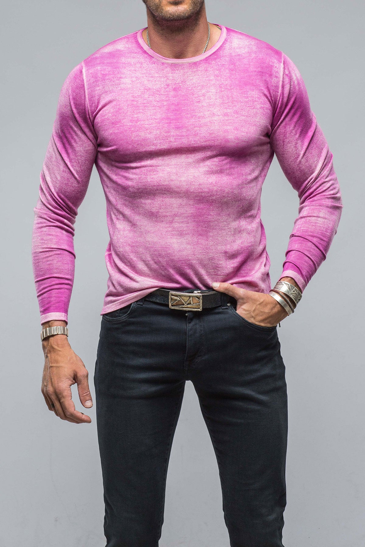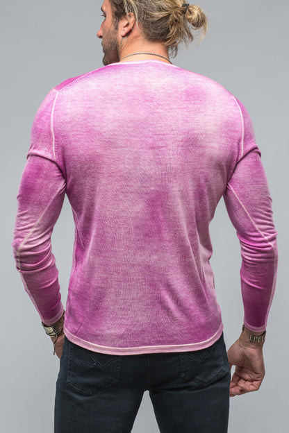 Lightweight 16 gauge cashmere knit starts its journey as a solid steel grey hue, then is artfully overdyed with a fuchsia color treatment. The resulting effect is a heathered melange of icy grey and vibrant pink.