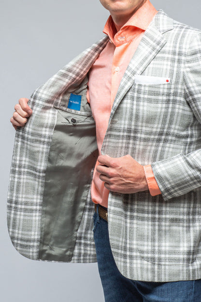 Single-breasted jacket with a check motif, the Porquerolles is made from an exclusive blend of cashmere, silk, and linen in shades of grey and white. The deconstructed nature of the garment and the use of soft yarn offer an authentic, personal experience of refined comfort that combines allure and freedom of movement with a focus on relaxed elegance. Perfect for both leisure and formal occasions, it will bring an elegant, sophisticated twist to casual looks.