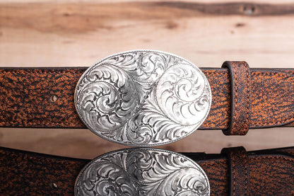 This understated buckle is perfect for those just starting their buckle collections or for more formal occasions. Hand-engraved in sterling silver, its oval face is adorned with beautiful, delicate scrollwork. The twisted fixed bail allows the belt to self-level, ensuring the buckle remains flat. Designed to fit all 1.5" belt straps, this buckle exemplifies exceptional craftsmanship and meticulous attention to detail.