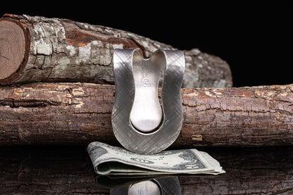 Elevate your everyday carry with this Large Wide Bend Money Clip, a true statement piece crafted from medium gauge sterling silver. The hand-cut design showcases a distinctive cut-out center, complemented by intricate crosshatch engraving that adds a refined touch of artistry. Handmade in Nevada, USA, this money clip merges practicality with elegance, making it an ideal accessory for securely holding your cash and cards. Measuring 1 3/4" by 2 7/8", it embodies a timeless design that stands out in any collection, offering both durability and sophisticated style.
